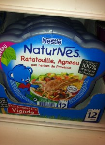 As promised, I am returning to the topic of baby food products in French grocery stores, which I skipped in my grocery tour. As I browsed the baby food section in the store near my in-laws’ house, I found a few interesting things.