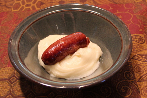 Here’s my aligot paired with a chicken sausage, which makes a variation on the classic French kids’ dish of purée saucisse, or Mashed Potatoes with Sausage: