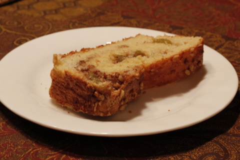 Melt the butter with the milk in a small saucepan over low heat. Allow to cool for a few minutes. Put the flour in a large mixing bowl and make a hole in the middle. Pour the butter/milk mixture, followed by 2 egg yolks (reserve the whites in the refrigerator), 2 tbps sugar (add an extra tablespoon if you think you might like it sweeter), pinch of salt, yeast, and 2 tbsp water. Mix well and cover with plastic wrap. Place in a warm spot and leave for 4-6 hours or until the dough gets air bubbles. It can be kept overnight in the refrigerator. Later, or the next day, make the filling. Put the whites in a bowl and add a pinch of salt. With an electric mixer, beat the whites, slowly adding the sugar until the whites form soft peaks. Next roll out the dough. First choose your baking dish and grease lightly. I used a standard loaf pan and would recommend this option. My grandmother’s recipe calls for a bundt pan, but this requires double the dough to make two sides of the ring. Sprinkle your work surface with flour and roll into a rectangle of which the short side is about the length of the loaf pan. Spread some egg whites onto the dough leaving a margin (don’t overdo it or it will squeeze out) and sprinkle cinnamon and nuts on top. Carefully roll the dough and try to seal the edges once you get to the end. Gently place into the pan, seem side up. Glaze the top with a bit of any remaining egg whites in the bowl and sprinkle more nuts on top. Cover with plastic wrap and set in a warm spot until risen and puffy (2-3 hours). If it’s 100 degrees outside like it is here, outside is a great place to rise your dough. Bake at 350 until golden brown, about 30 min. Remove from the pan to cool. This bread is wonderful for breakfast, brunch, or for an afternoon snack. Oh, and my son liked it too!