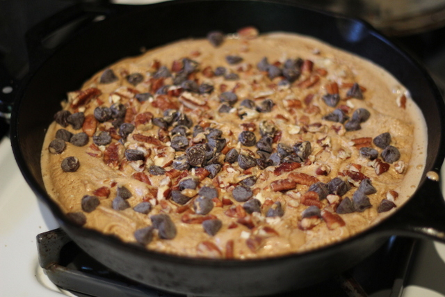 Pour into a prepared pie crust. I highly recommend a homemade one- so much more delicious and no sketchy fats, and they really aren’t hard to put together. Smooth out the surface and top with chopped pecans and chocolate chips. Press them in slightly and bake at 350 for about 30 minutes.