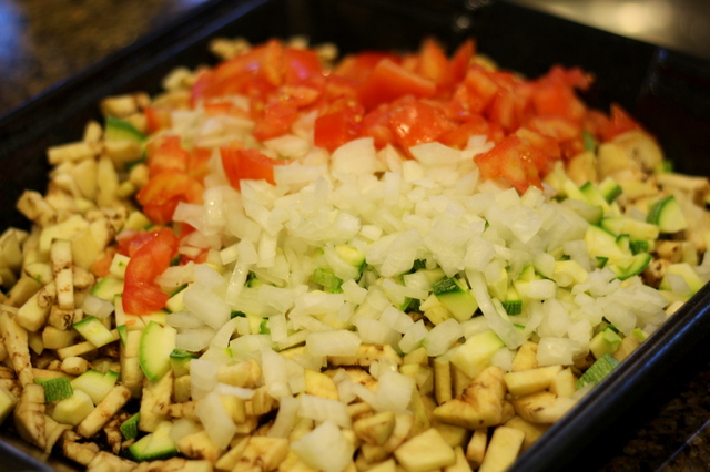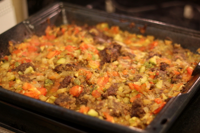 So after, according to my brother, a robust exchange in Arabic over the situation in Syria (Jake was certain that they were about to exchange punches, but apparently it was just a friendly chat, Arab-style) they returned to the house. With all this beautiful produce and meat, I asked Suzanne’s father Hisham to make me something that reminds him of his childhood in Syria. He told me about a simple dish that his mother would assemble at home and then take to the local baker to be baked in a large oven. The dish was simply called meat in the oven, and involves setting a layer of seasoned groung beef on a bed of finely chopped vegetables. It is quite similar to ratatouille, but the vegetables are diced finely, giving a different texture and feel to the dish.