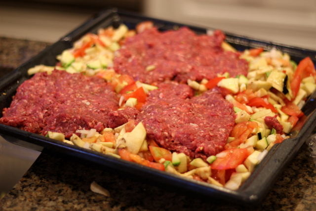 Mix the vegetables together in an ovenproof dish. Next, mix the spices and salt into the ground beef and massage in with your hands. Flatten round pieces of meat to about 1/4 inch thickness and lay evenly over the vegetables.