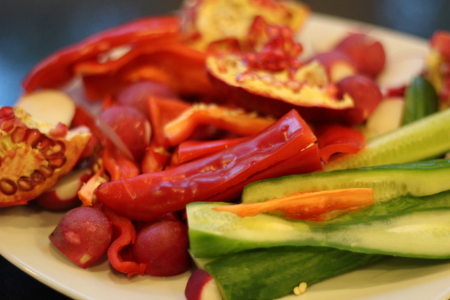 For our dinner, we served this with freshly baked pita bread, a plate of cut vegetables, and a swig of olive oil. The plate of fresh raw vegetables seems to be a common accompaniment to meals in the Middle East, and I think it’s a wonderful tradition. Here, we cut peppery radishes, mild chile peppers, baby cucumbers and pomegranates and just sat them on the table to nibble on before and during the meal.