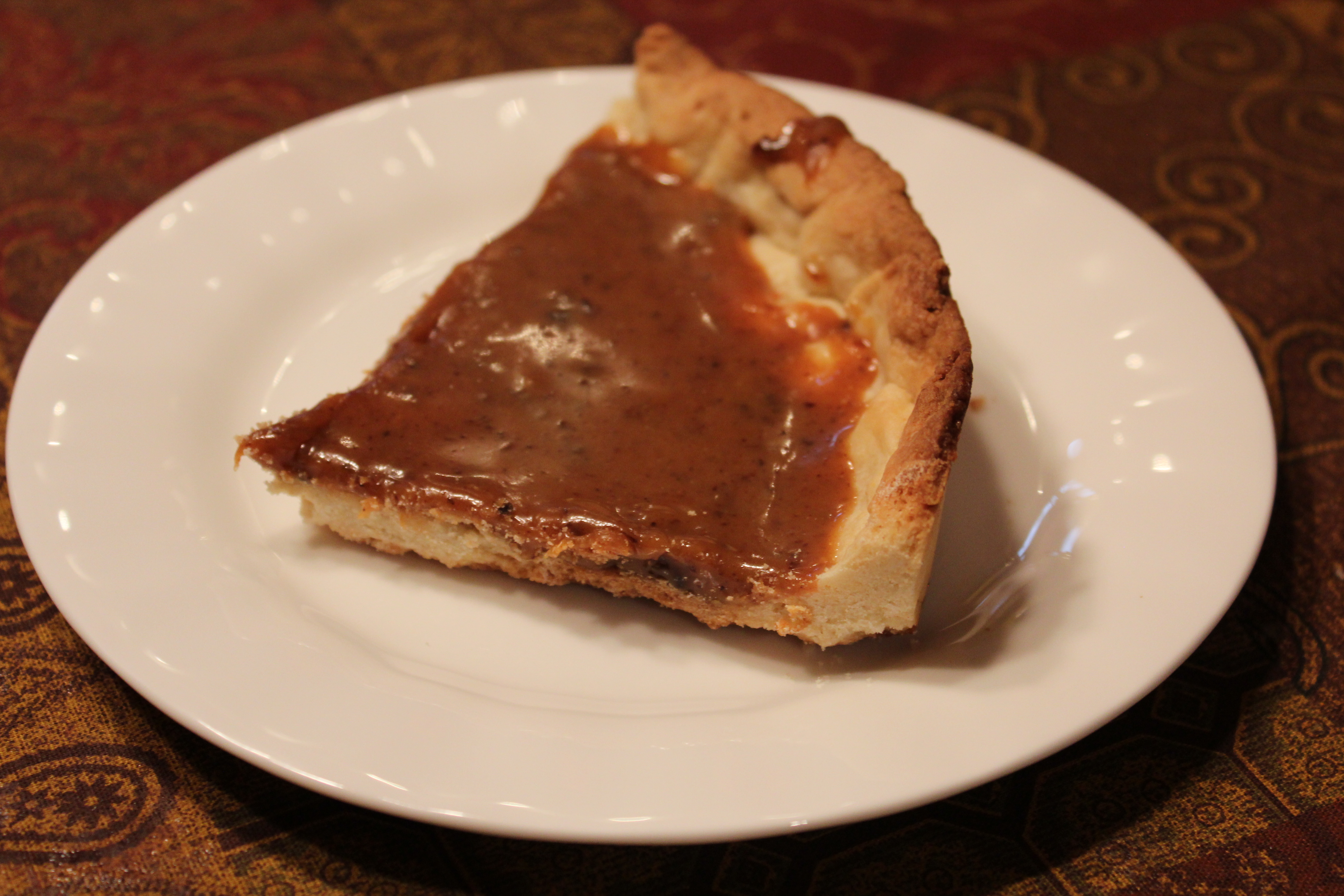 Press the dough into a round cake pan or pie tin, being sure to form high rims around the edge which will hold the caramel in later. Punch the dough several times with a fork and bake at 375 until golden.