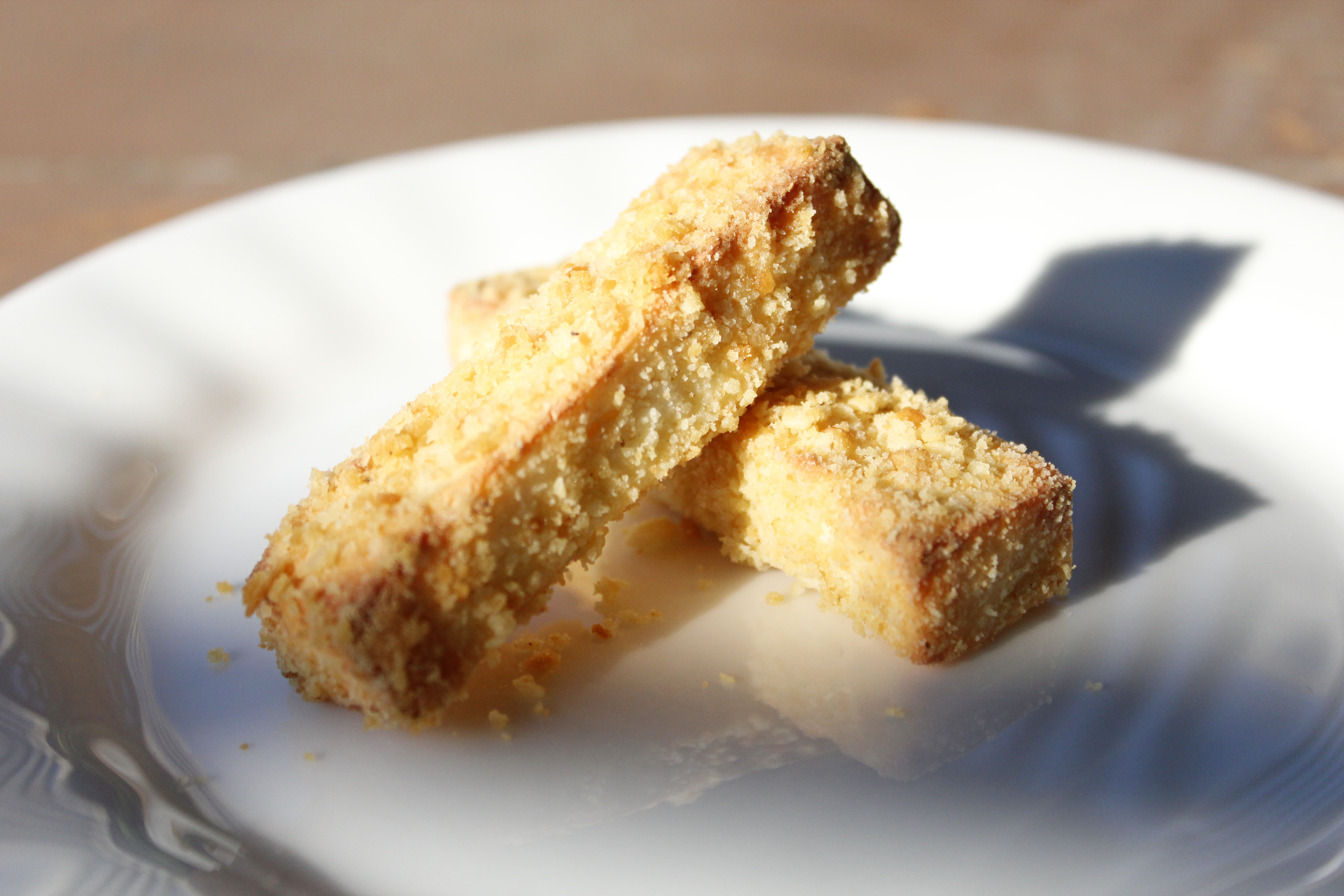 When I tested a couple of these versions, I found that they worked just fine, but were a little more reminiscent of mozzarella sticks than chicken fingers- certainly not a bad thing in my book! The non-melting cheeses allow you to bake the sticks without them melting all over. The smooth surface of the paneer requires a little extra pressing to get the crumbs to stick, but they came out beautifully. Served with tomato sauce, these would be great as an appetizer for a party. Here are my paneer fingers: