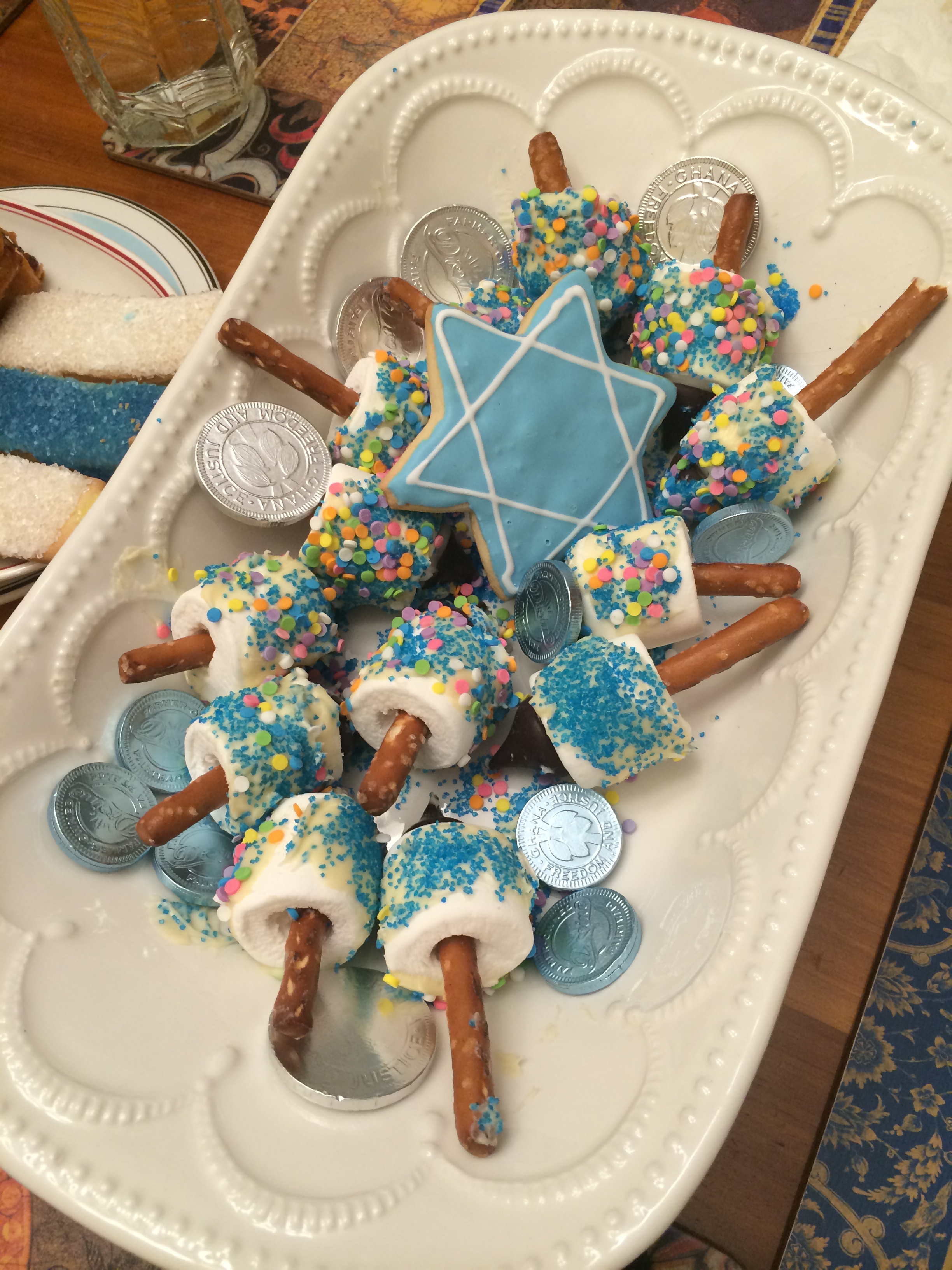 Just wanted to wish everyone a happy Chanukah, and share with you a picture of my pinterest-fueled first night treats. I made marshmallow hershey kiss dreidels that came out very cute.