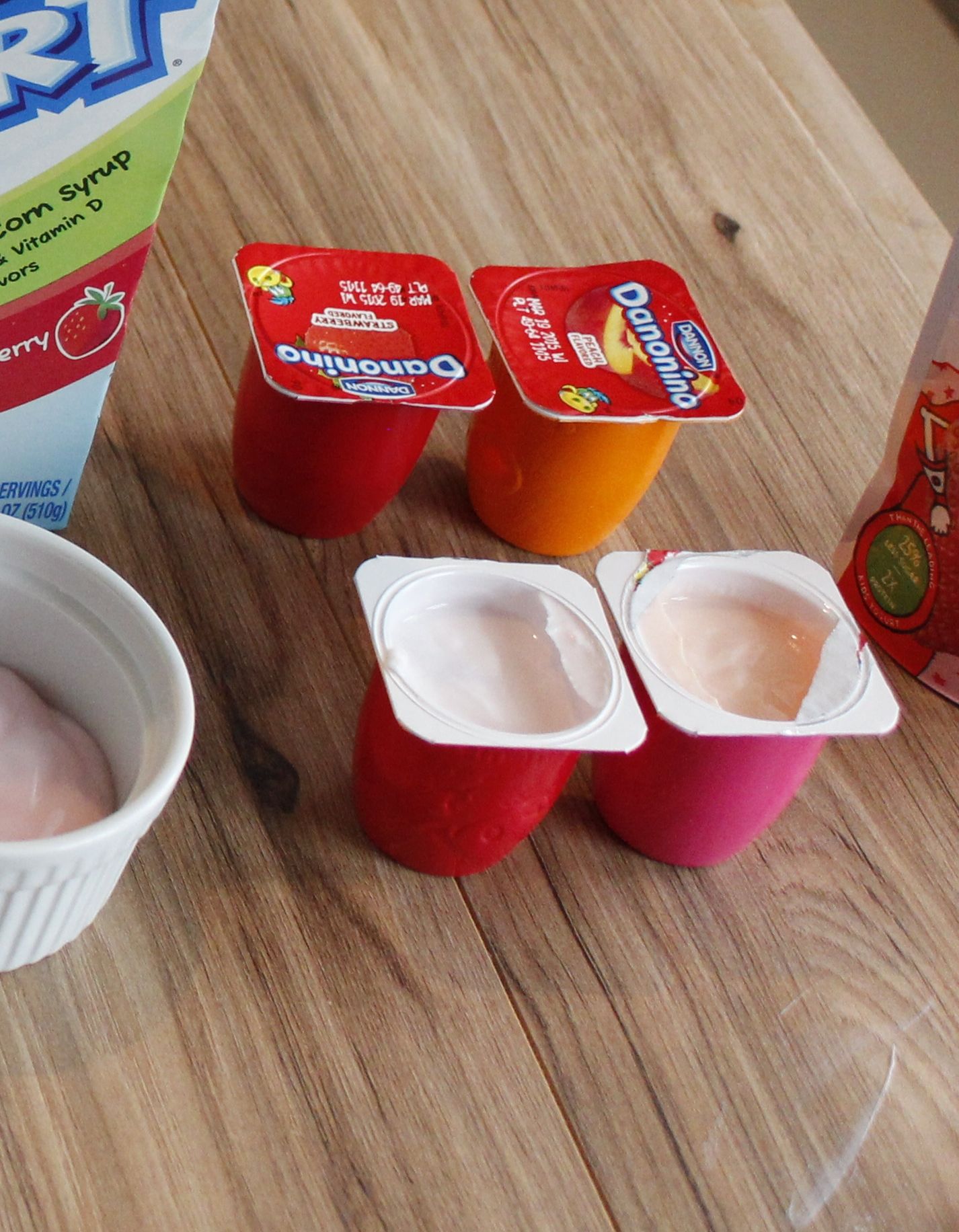 Here was my selection for today’s tasting: Gogurt in Burstin’ Melon and Cotton Candy, Simply Gogurt Strawberry, Chuck E Cheese in Strawberry Banana and Cotton Candy, (I realized now that the Chuck E Cheese are only available at Walmart here, but those were the ones that appealed to my son the day we did the test, so we went for it), Chobani Grape and Strawberry, and Danonino Peach and Strawberry Banana.