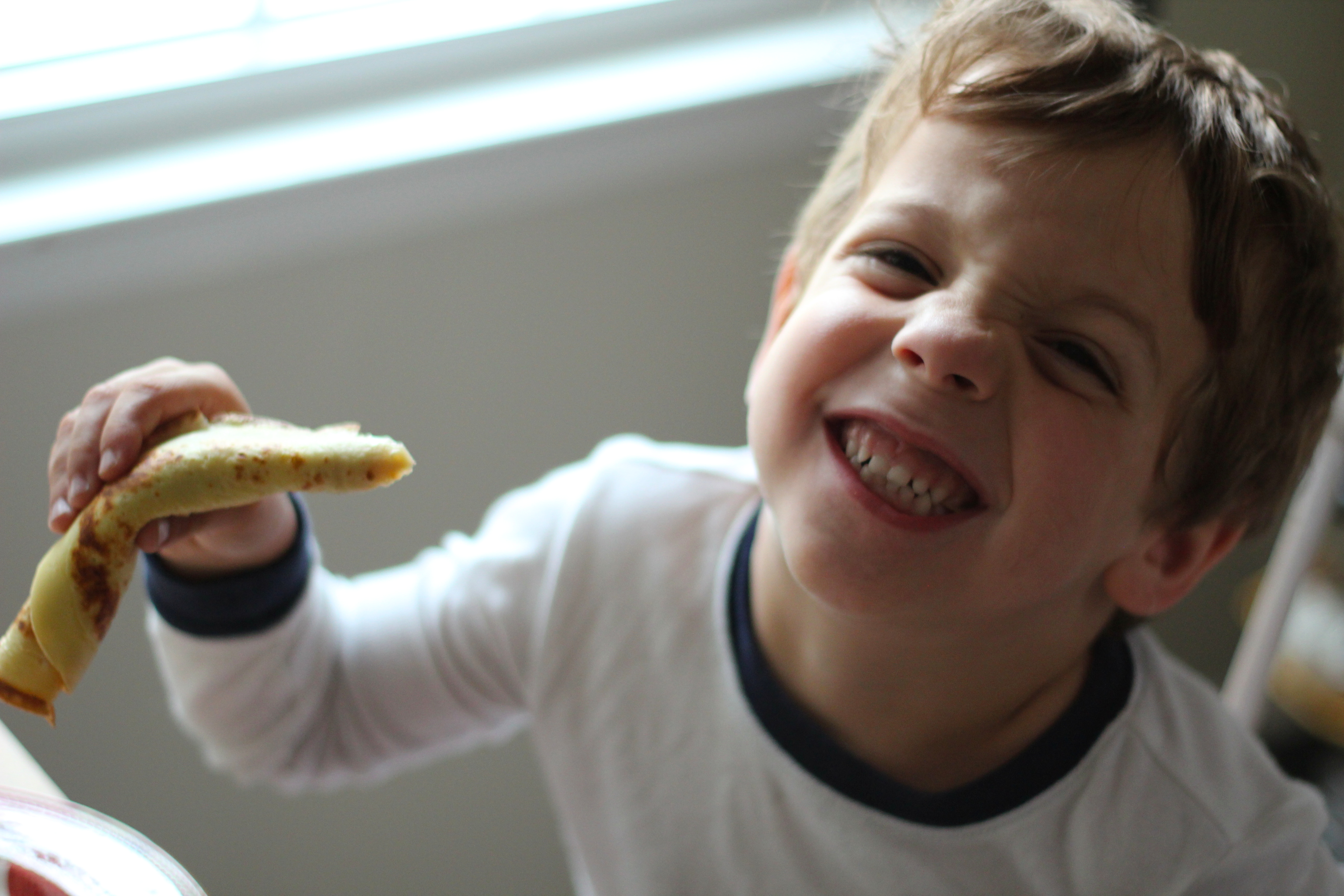 I wanted to re-post about a cool trick I came up with that has become one of my go-to breakfasts, even on hurried school mornings. And that is the Pancakelette, or what has now become more of a crêpelette, which is my way of getting an egg into my non-egg-loving kiddo. Rather than following the pancake batter instructions, I took an egg and put in just enough mix (and milk or oil, per instructions) to make a loose, eggy batter. Once cooked, the child in question thinks he or she is eating a pancake, when in fact they are eating a fried egg in disguise. Very tricky, I know.