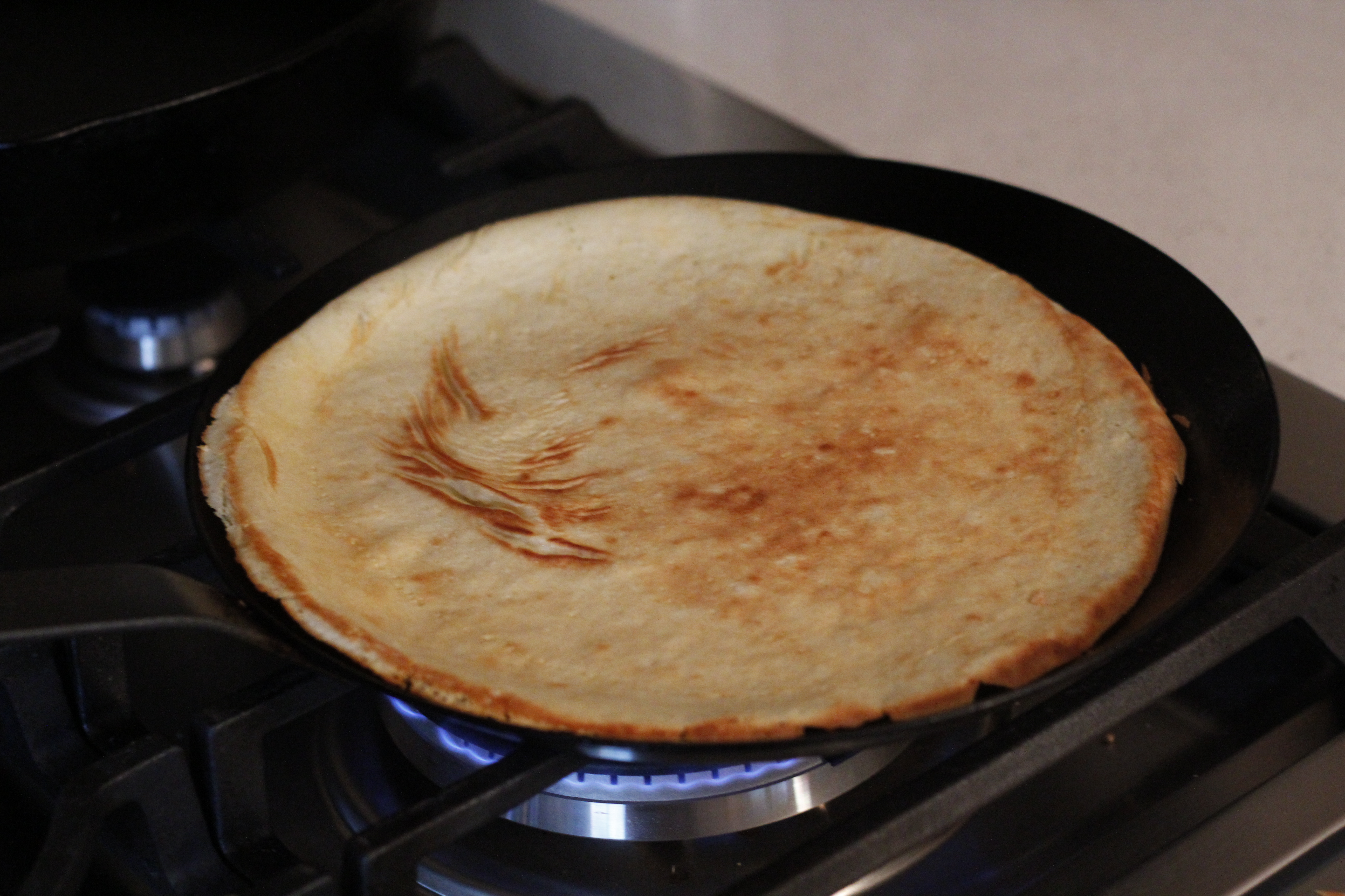Coat the pan with a layer of oil or butter, wiping it down slightly with a paper towel (this will ensure the batter spreads evenly). Pour the batter into the pan and tip to spread thinly all around. Once the edges start to fold up slightly, flip and cook the other side. Press down to keep flat shape.