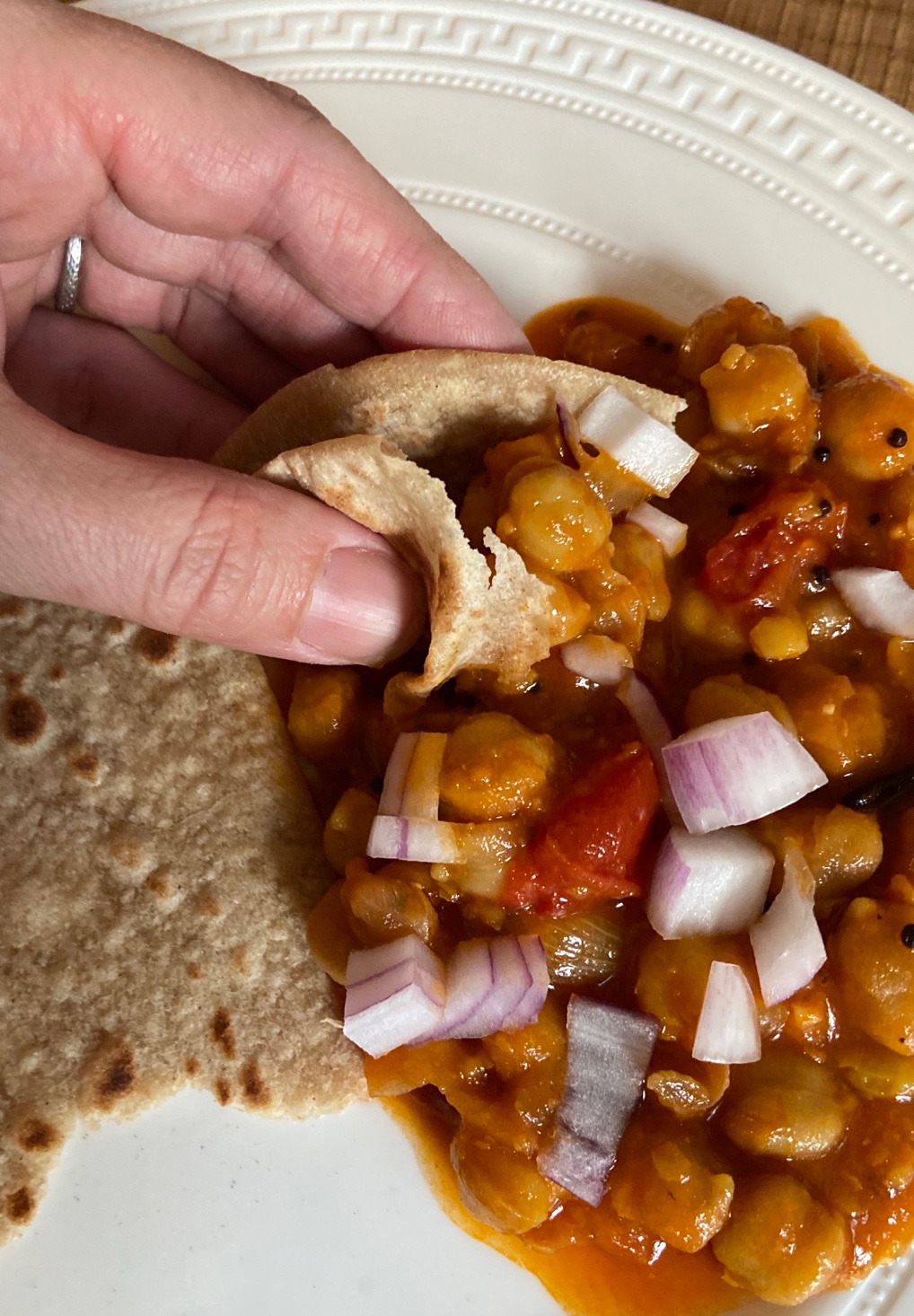 It’s a simple and filling vegetarian dish that goes brilliantly with a variety of Indian-style breads such as naan, chapati, or the incredible and decadent fried bhatura. When paired with bhatura, you get the classic North Indian speciality, chole bhature. This time, I made a simple chapati with flour from the Indian section of my international grocer. (This is a fun and simple thing to try if you are going to make Indian dishes. Just look for roti or chapati flour at your Indian or international grocer.) Or another option is to look through the frozen section to find frozen naan or chapati.