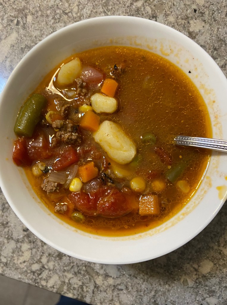 A good beef vegetable soup in my opinion has plenty of vegetables such as potatoes, carrots and peas that have cooked down and married with the broth they’re in; tender chunks of meat; and a rich tomatoey beef broth.